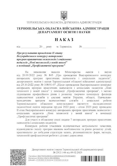Вітаємо переможців ІІ етапу Всеукраїнського конкурсу авторських програм "Нові технології у новій школі" в номінації "Профілактичні програми"